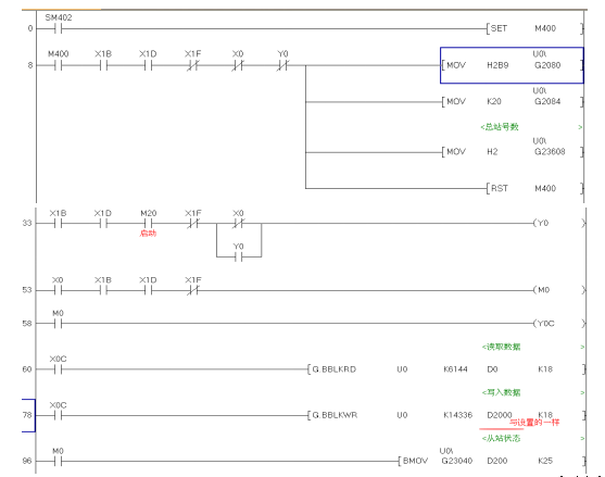 主站QJ71PB92V的程序:把主站要傳送給從站的數據寫進D2000-D2017,讀取從站的數據在D0。