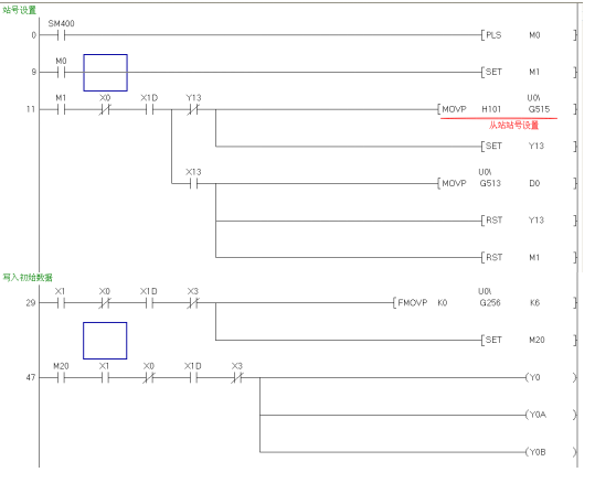從站QJ71PB93D的程序:把寫給主站的數據寫進D2000-D2001,讀取主站的數據在D1000-D1001,