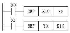 (1)輸入輸出刷新指令REF REF(P)指令的編號為FNC50。三菱FX系列plc采用集中輸入輸出的方式。如果需要最新的輸入信息以及希望立即輸出結(jié)果則必須使用該指令。如圖1所示,當(dāng)X0接通時,X10~X17共8點將被刷新;當(dāng)X1接通時,則Y0~Y7、Y10~Y17、共16點輸出將被刷新。