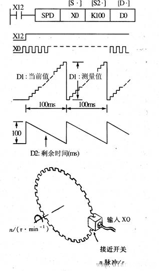 速度檢測指令SPD的編號為FNC56。它的功能是用來檢測給定時間內(nèi)從編碼器輸入的脈沖個數(shù),并計算出速度。如圖5所示,[D. ]占三個目標(biāo)元件。當(dāng)X12為ON時,用D1對X0的輸入上升沿計數(shù),100ms后計數(shù)結(jié)果送入D0,D1復(fù)位,D1重新開始對X0計數(shù)。D2在計數(shù)結(jié)束后計算剩余時間。