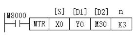 (3)矩陣輸入指令MTR MTR指令的編號為FNC52。利用MTR可以構(gòu)成連續(xù)排列的8點輸入與n點輸出組成的8列n行的輸入矩陣。如圖3所示,由[S]指定的輸入X0~X7共8點與n點輸出Y0、Y1、Y2(n=3)組成一個輸入矩陣。PLC在運行時執(zhí)行MTR指令,當(dāng)Y0為ON時,讀入第一行的輸入數(shù)據(jù),存入M30~M37中;Y1為ON時讀入第二行的輸入狀態(tài),存入M40~M47。其余類推,反復(fù)執(zhí)行。