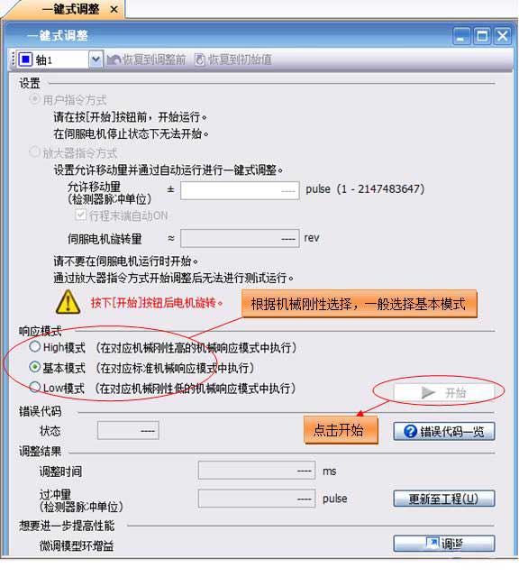 一鍵式調(diào)整需要在伺服電機(jī)運(yùn)行中進(jìn)行調(diào)整,因此,在進(jìn)行調(diào)整期間,需要使伺服電機(jī)進(jìn)行正反轉(zhuǎn)反復(fù)運(yùn)行。可以先使用“測試運(yùn)行”功能使伺服電機(jī)進(jìn)行定位運(yùn)行。