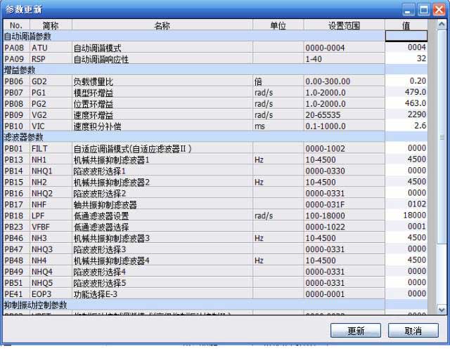 窗口中的三菱伺服參數(shù)即是伺服一鍵式調(diào)整時自動調(diào)整的參數(shù)。