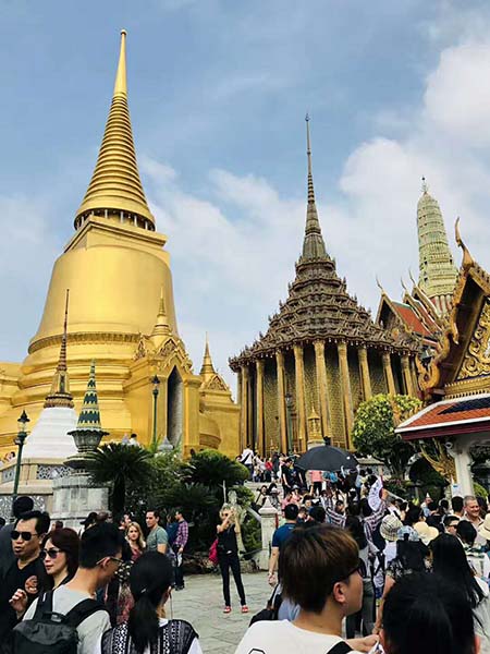 第一站:首先是到泰國必游的大皇宮與玉佛寺,游大皇宮和寺有許多的禮儀規(guī)矩,如:在入大皇宮時,不能穿拖鞋,上衣不能穿無袖下身著裝必須蓋過膝蓋,入寺廟需脫鞋等等,不過在此之前海藍的小伙伴早就做好相關的功課,當然是順利進行游玩,小編提醒:還沒去過泰國旅游的小伙伴在去泰國一定要做好相關功課,了解當?shù)亓曀孜幕蝗粫粨踉陂T外喲!