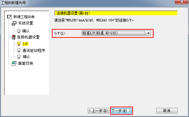 2.1.5 設(shè)置I/F端連接設(shè)置,(標(biāo)準(zhǔn)I/F 標(biāo)準(zhǔn) RS232)默認,后單擊[下一步]