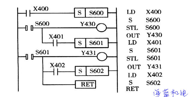 圖1 -11 所示,當觸頭 X400 閉合時,狀態器S600 得電并內部自鎖,其步進輸出觸頭